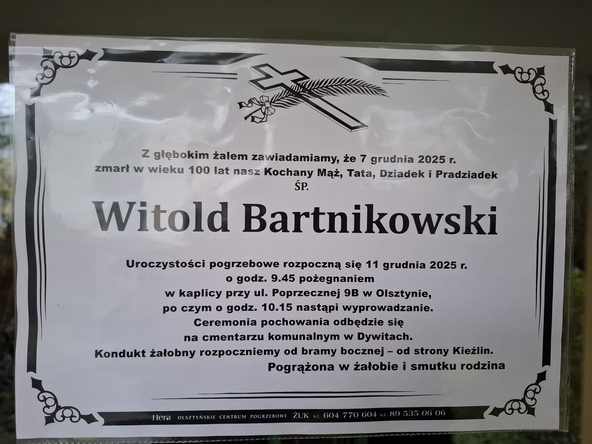 Uroczystości pogrzebowe Witolda Bartnikowskiego rozpoczną się o godzinie 9.45 w kaplicy przy ulicy Poprzecznej. O 10.15 nastąpi wyprowadzenie. Ostatni żołnierz „Parasola” spocznie na cmentarzu w podolsztyńskich Dywitach.
