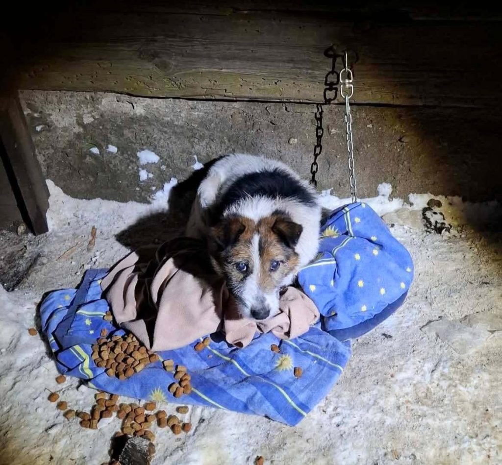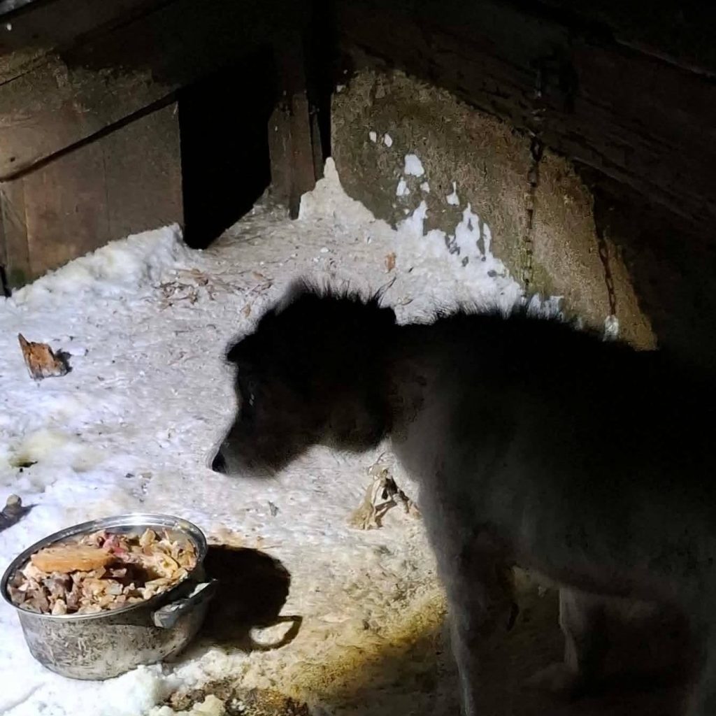 Pogorzelisko, spalona posesja i na łańcuchu Mrozik. Widać było, że miał dosyć wszystkiego – skulony, zmarznięty i bardzo głodny. Był na wielkim łańcuchu, który splątał się w kulę, która zamarzła. Ta kula lodu ciągnęła go za ogromną, gnijącą ranę z wyrośniętym łańcuchem
