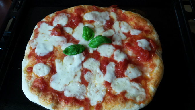 Mąkę wysypać na stolnicę, zrobić w środku dziurkę i wlać drożdże rozmieszane z cukrem i odrobiną letniej wody. Zagniatać ok. 15 minut z dołu do góry, dolewając pozostałą ilość wody. Nie rozrywać! Uformować w półkulę, nakroić na krzyż i odstawić w ciepłe miejsce na ok. godzinę. Po tym czasie wyrośnięte ciasto dzielić na ćwiartki, formować palcami placek, który powinien być tak elastyczny, że nie będzie się z powrotem kurczył. Sosu nie musimy gotować, bo się przepiecze, więc wylewamy pomidory bez skórki z puszki, lekko solimy i nakładamy na placek. Mozzarellę kroimy w kostkę i posypujemy nią pizzę. Wkładamy do piekarnika nagrzanego do ponad 200 stopni C na ok. 15 min. Po wyjęciu posypujemy paroma liśćmi świeżej bazylii. Palce lizać!!! 🙂