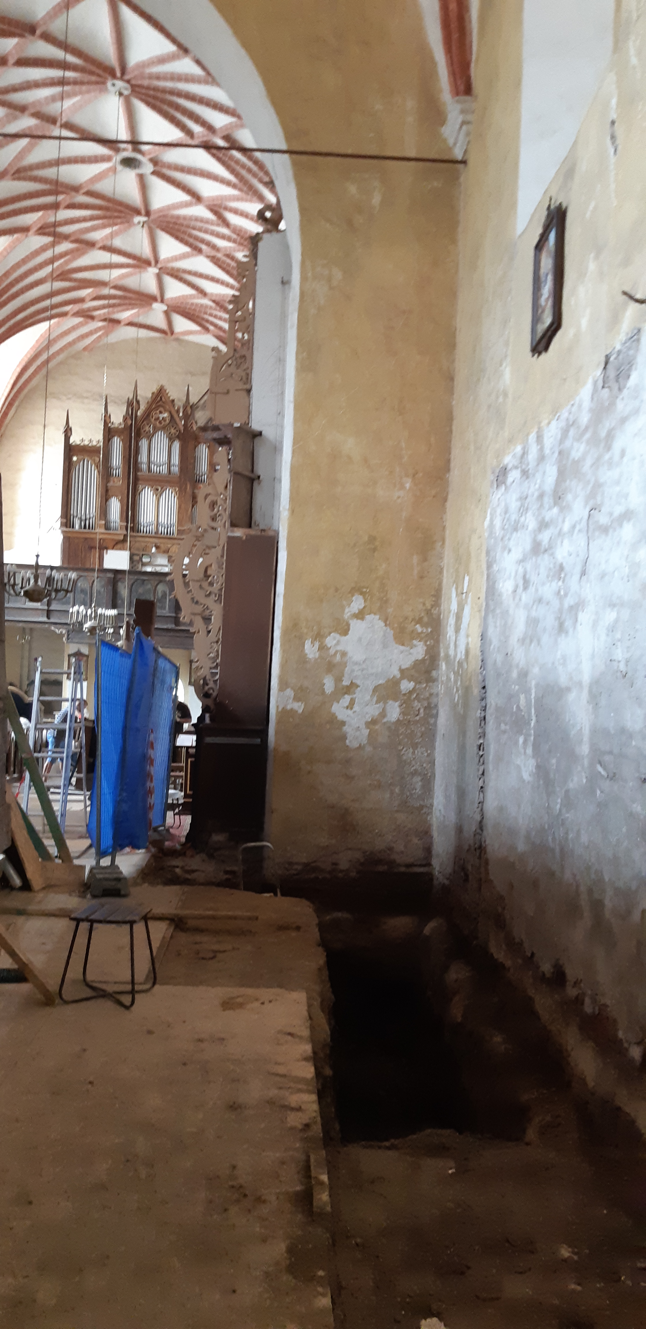 Pod posadzką, po demontażu stalli, znaleziono ceramiczny glazurowany kubek z uchem, wypełniony monetami. Skarb ukryto pod ziemią w północno-zachodnim narożniku prezbiterium, przy tzw. łuku tęczowym.