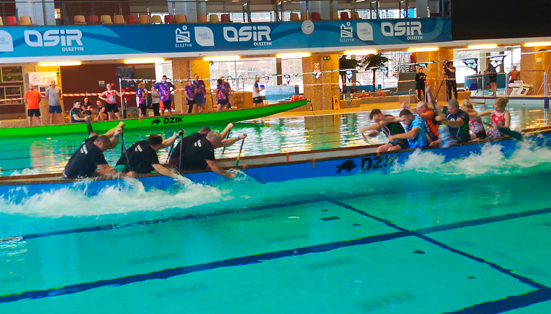 Urozmaicenie i rekompensata tego, że nie możemy całym rokiem pływać po naszych jeziorach. Obecnie jest dość zimno, temperatura na minusie, jest końcówka listopada, więc już kilka dobrych lat temu wywiązała się taka inicjatywa, żeby wprowadzić smocze łodzie na basen. Konkurencja jest bardzo prosta, dwie załogi siadają naprzeciwko siebie w łodzi, wiosłują naprzeciwko siebie na zasadzie, która drużyna którą przepcha