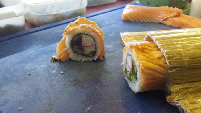 Futomaki california – czyli odwrócone futomaki (ryż na wierzchu). Na połowę płatka nori nakładamy warstwę ryżu (do połowy), tak by ok. 1 cm wystawał poza nori (ryż będzie sklejał rolkę). Odwracamy ostrożnie na drugą stronę i bezpośrednio na nori nakładamy wasbi, ananasa, szczypiorek, marynowaną dynię i rzepę i paluszki krabowe. Zwijamy w rolkę na wierzchu której jest ryż. Obkładamy ją płatami łososia, posypujemy cukrem trzcinowym i za pomocą opalarki karmelizujemy. Kroimy na centymetrowe talarki.