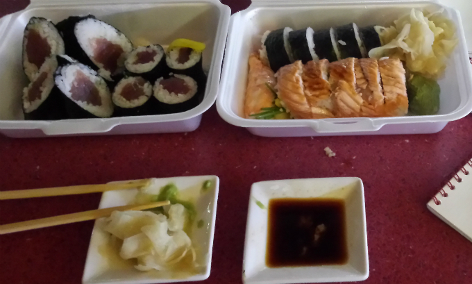 Składniki: mata do zawijania (owinięta w folię spożywczą), ostry nóż, ryż do sushi, surowa ryba: łosoś i tuńczyk, paluszki krabowe, duże krewetki do sushi, nori (płaty wodorostów), wasabi (chrzan japoński), imbir marynowany, sos sojowy i warzywa: marynata z dyni, rzepy, ogórka, ogórek świeży, szczypior, ananas i trochę cukru trzcinowego.