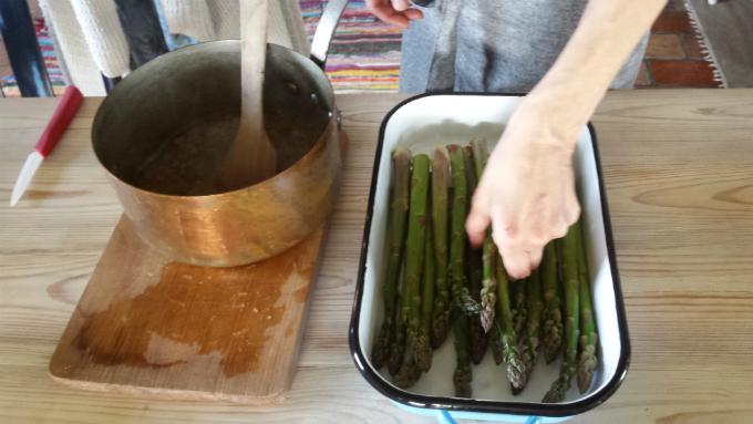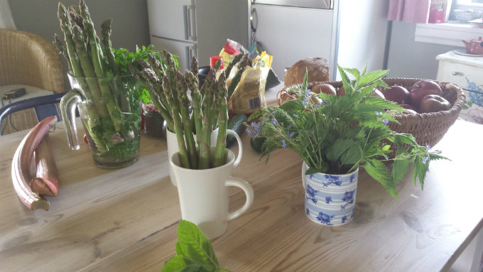 Dziś w wydaniu Ewy: szparagi z rabarbarem na grzance z czosnkiem i pokrzywą. Oczywiście jak na ewępe przystało szparagi pochodzą z dziko rosnącego, dawnego, wiejskiego ogródka.