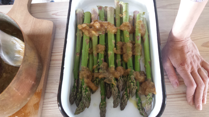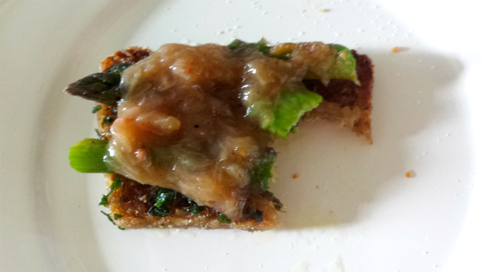 Szparagi umyć i odkroić lub oderwać zdrewniałą końcówkę (ewape zapiekała całe a potem odkroiła). Umieścić w rynience lub brytfance. Rabarbar obrać ze skórki, pokroić w kostkę i zasypać w rondelku cukrem trzcinowym. Dolać trochę oliwy. Postawić na ogniu. Do rabarbarowej „papki” dodać pieprz czerwony i syczuański. Dodać parę poszarpanych listków mięty. Szparagi skropić oliwą i posmarować masą rabarbarową. Zapiec w piekarniku (180 stopni C – góra-dół) ok. 15-20 minut. Chleb żytni pokroić na kromki. Posiekać pokrzywę i czosnek i zasmażyć na oliwie. Włożyć na to chleb i opiec z jednej strony. Na grzanki wykładać szparagi polane masą rabarbarową.