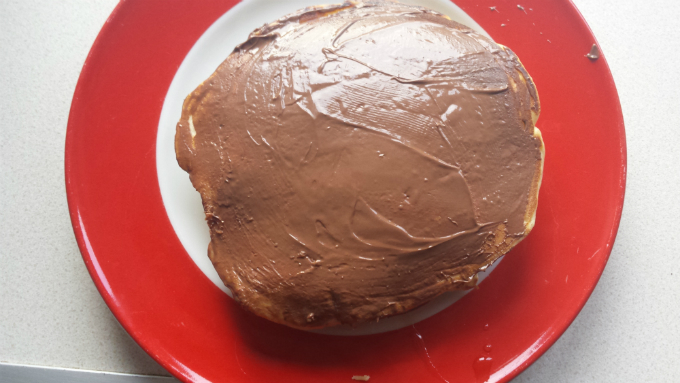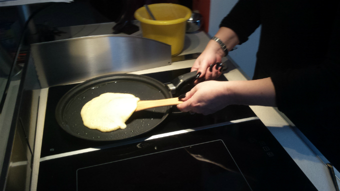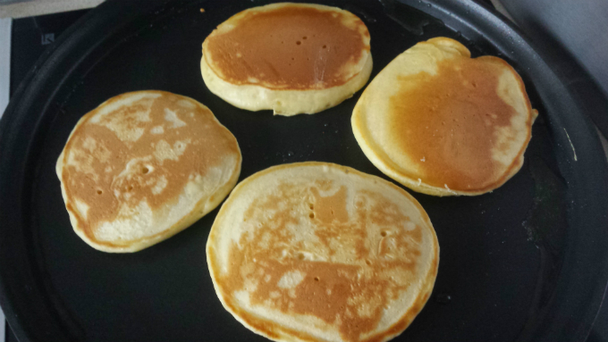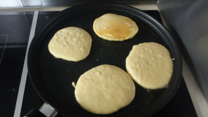 Składniki: 150 g mąki pszennej, 1 łyżeczka cukru, pół łyżeczki soli, 2 torebki cukru waniliowego, 1 łyżeczka proszku do pieczenia lub sody oczyszczonej, 225 ml mleka, 2 żółtka i 1 białko, półtorej łyżki stopionego masła, olej lub masło sklarowane do smażenia. Do posmarowania – nutella, do polania – syrop klonowy.