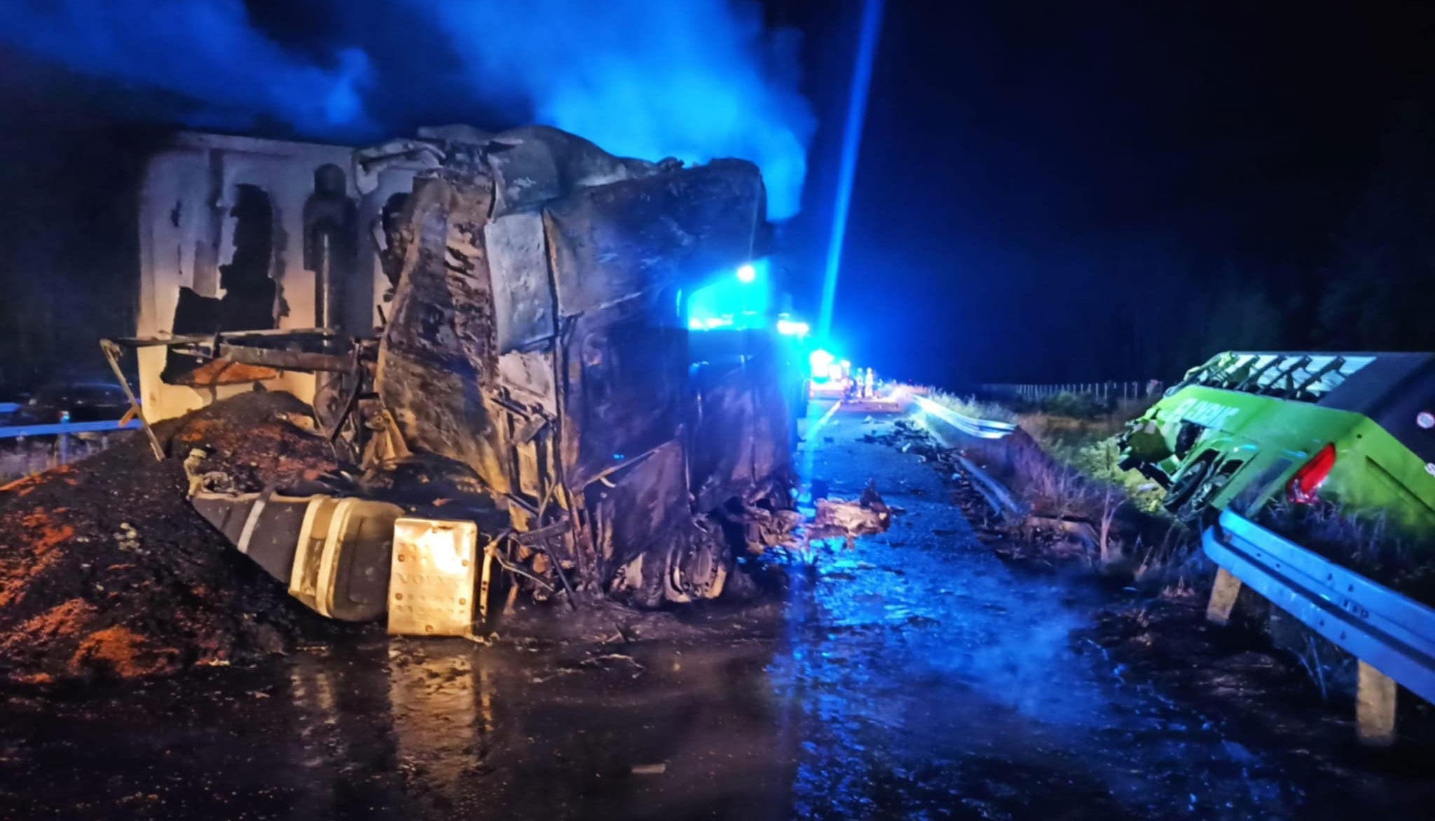 Służby wciąż sprzątają miejsce wypadku. Droga będzie zablokowana do czasu odholowania rozbitych pojazdów. Może to potrwać co najmniej kilka godzin, a nie wykluczone, że do czwartku, jeżeli zniszczenie nawierzchni drogi po pożarze ciężarówki okaże się poważne.